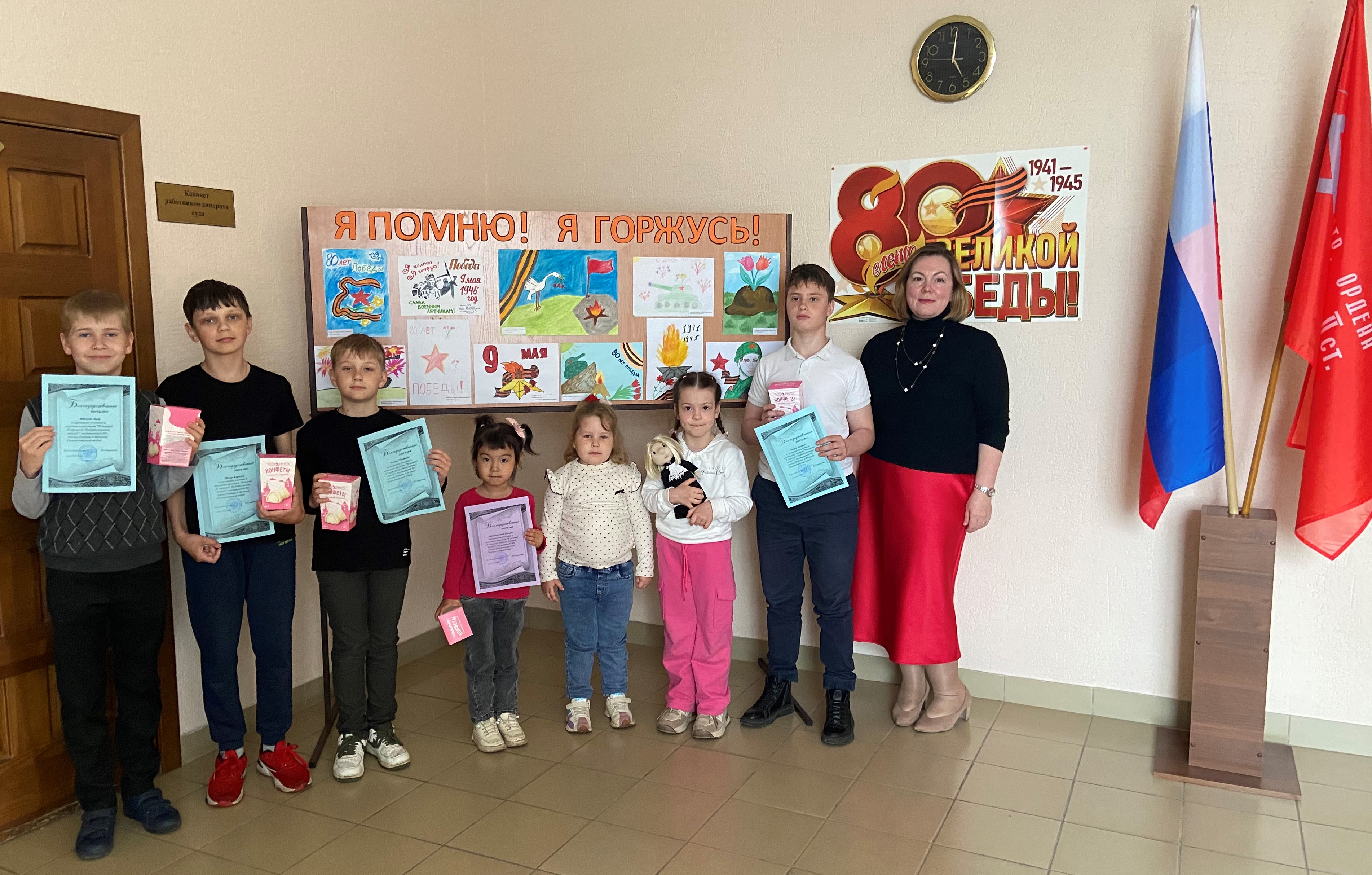В Павлоградском районном суде Омской области прошла выставка детских рисунков «Я помню! Я горжусь! Победа глазами детей!», посвященная 80-летию Победы в Великой Отечественной войне, в которой приняли участие дети судей и сотрудников районного суда, судебного участка №24 в Павлоградском судебном районе Омской области в возрасте от 5 до 16 лет. В творческих работах ребята выразили свое особое отношение к Дню Победы, которое у них сложилось из рассказов родных, из прочитанных книг, просмотренных фильмов о войне. Каждый рисунок был выполнен с большой любовью и теплотой детских сердец. Председатель суда Евгения Сергеевна Лавринова в торжественной обстановке вручила всем участникам мероприятия благодарственные письма и сладкие подарки, поблагодарила юных творцов за активное участие, за содержательные творческие работы, которые подарили трогательные впечатления сотрудникам и посетителям районного суда.